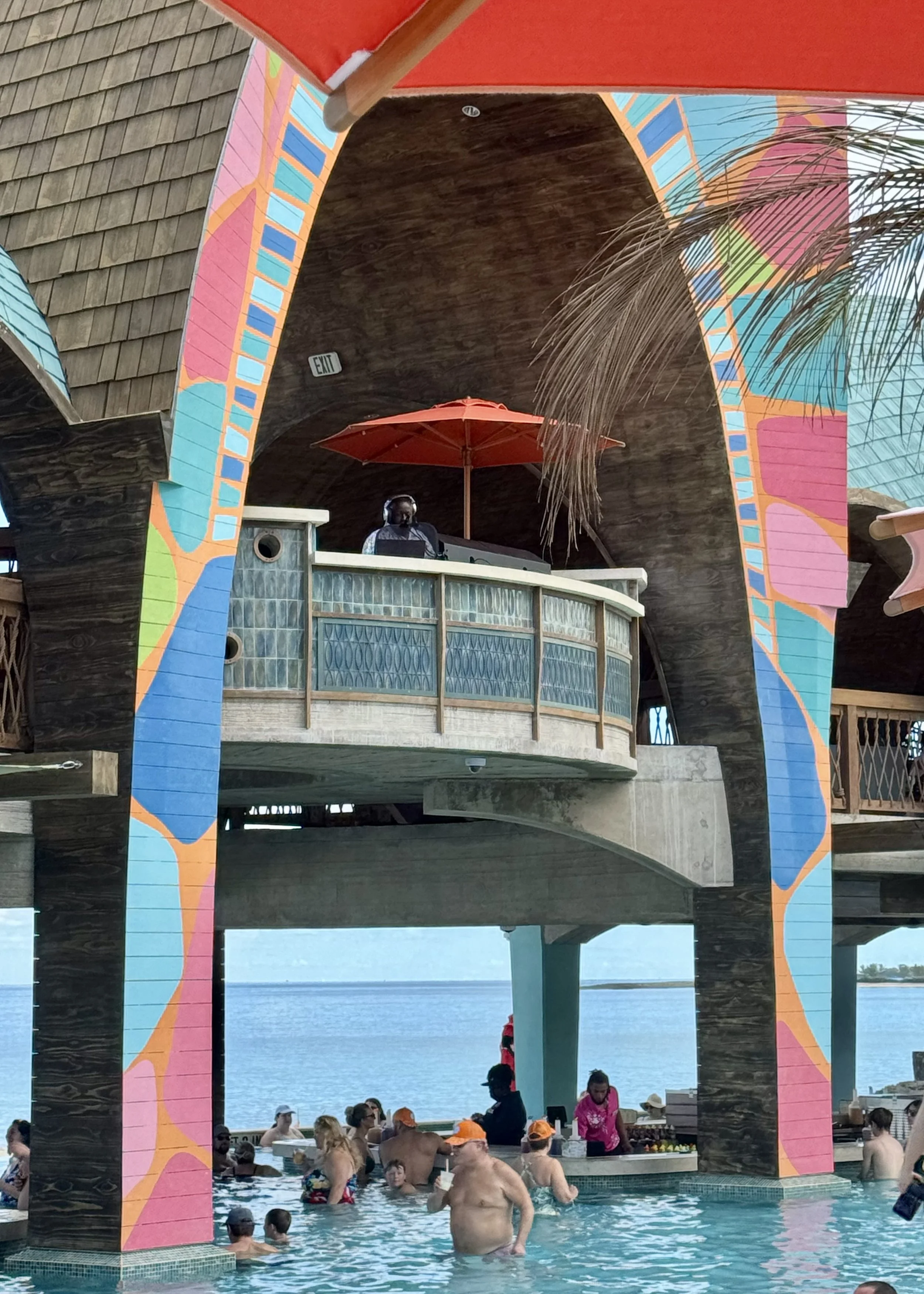 The Royal Beach Club at Paradise Island in Nassau opened officially in late December of 2025. The beach club itself is designed for passengers of Royal Caribbean and Celebrity ships while they are in port in Nassau. The beach club is staffed and run by Bahamians (whereas Perfect Day at Cocoay is staffed mainly by the ship’s crew) and consists of three major zones: Chill Beach, Party Cove and Family Beach. To get to the beach club, you will take a fun colored ferry from the port over to one of the two entrances to the beach club. Each area has a heated pool and beach access with the main focus in the Party Cove area being the swim-up bar and DJ area. There are restaurants in each zone and multiple bars. There are as well servers that will bring drinks directly to your chairs or loungers. Each area has really nicely maintained bathrooms (to be fair: the place had only been open maybe 3 weeks), and there were first aid areas and even an area to shop. Also, in each zone there were cabanas, even an Ultimate Family Cabana that was complete with a waterslide, that you can rent as various price points.