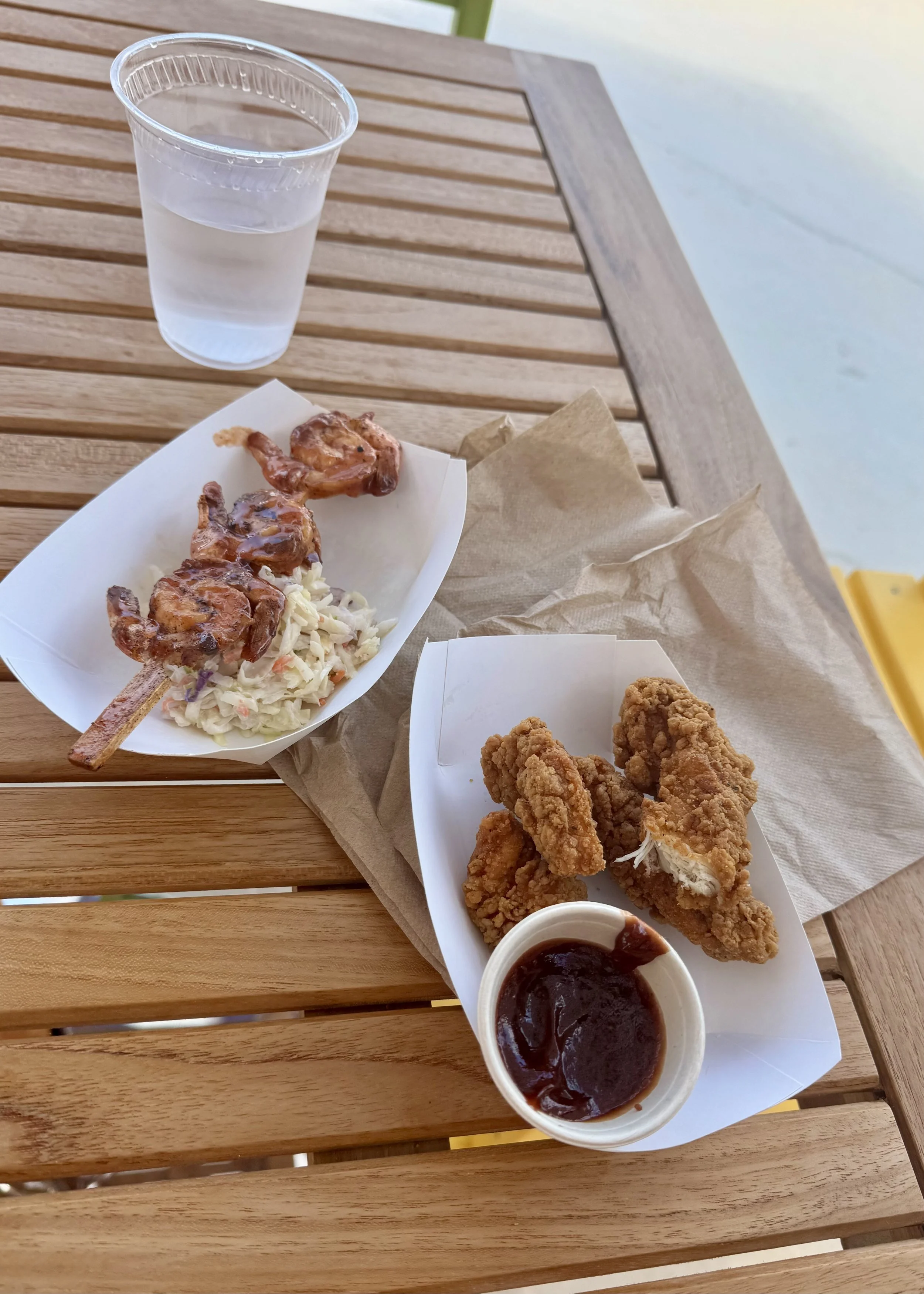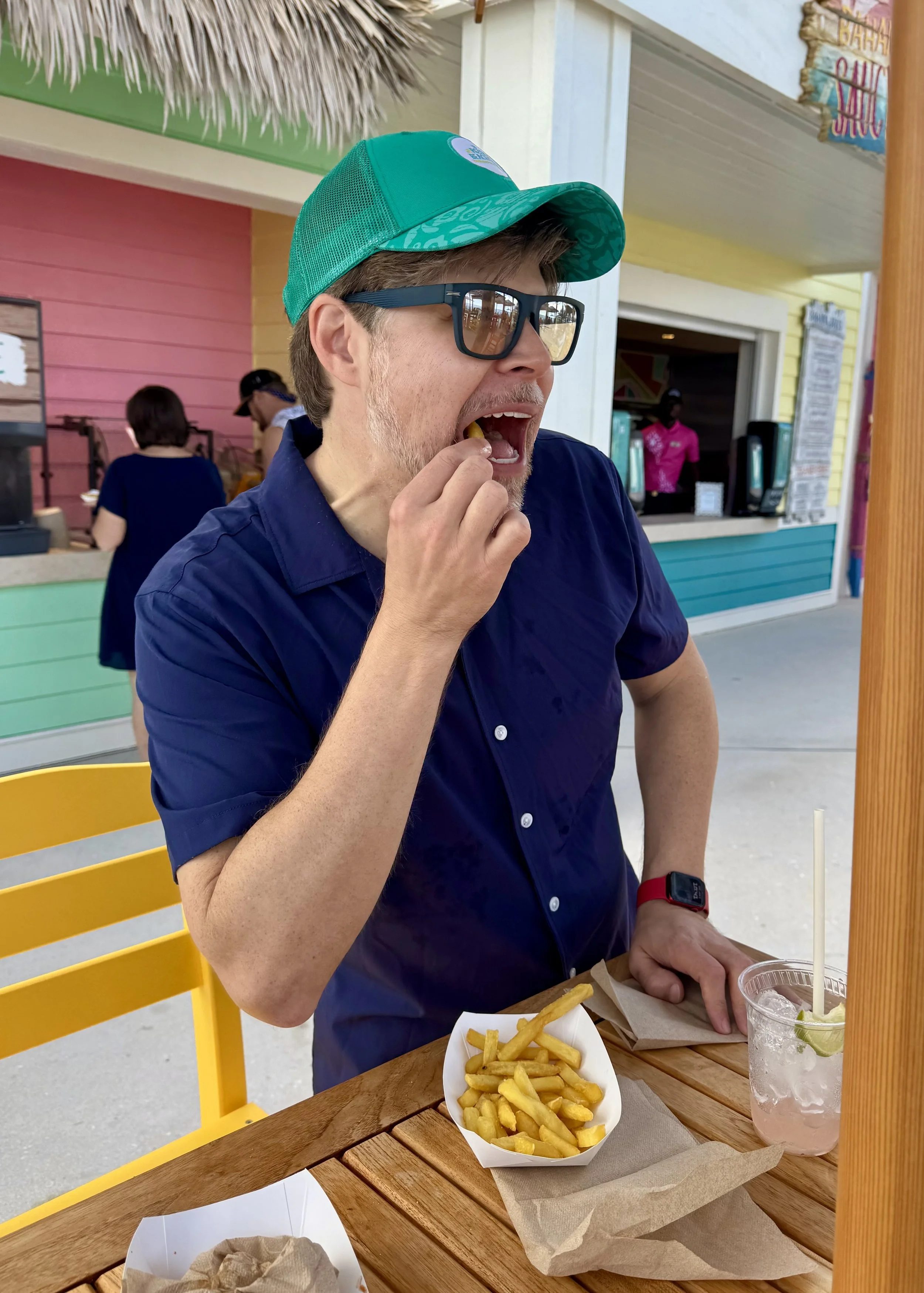 At some point we decided that we were hungry and wanted to try out the food. It’s my understanding that the food menu has been updated some since we were there, so I can’t speak on the entirety of what is currently being offered. We tried a bit of everything. While the seafood items were the star of the show, my husband enjoyed the chicken tenders and fries also. They had a crab cake sandwich, which was really tasty, and a shrimp skewer that had a delicious sauce on it. My husband was pleased to find that not only did they have soft serve on the island but they also had a pineapple flavor, which was a nice change of pace from the vanilla and chocolate that is typically offered. While we found that the food was all pretty tasty, we didn’t really feel that it provided the plussed experience that was even offered at the Hideaway Beach Club, nor was there the variety that you could find at the complimentary buffet offered on Cococay. The food is definitely an area that could be improved, especially if they are going to continue with their higher price point.