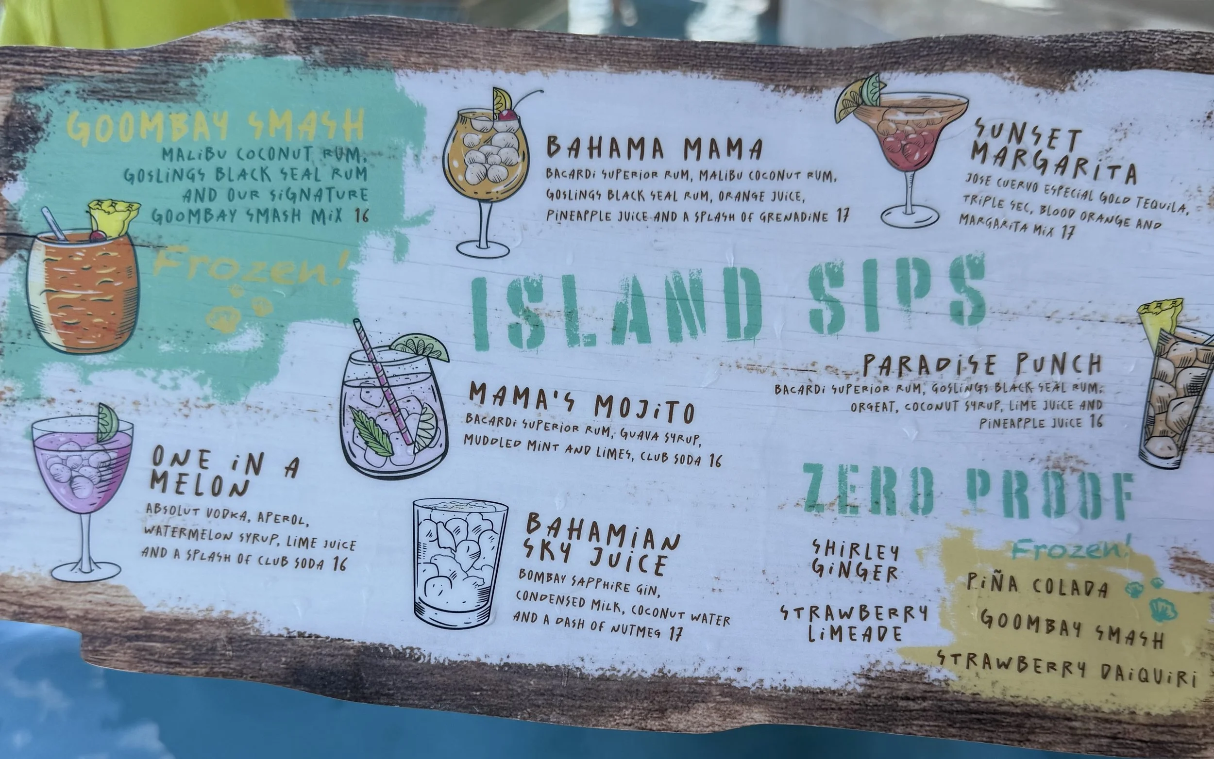 As far as the drinks are concerned, we did really enjoy having everything be unlimited. Since we have loyalty status that gives us complimentary drinks while on board, we usually don’t splurge for the drink package anymore. But, we do enjoy the freedom that a drink package provides. One nice thing about it is that you can order a drink and if you don’t like it then you can trade it in for something that you enjoy more. The beer that was served, which comprised of beer only made in the Bahamas- which hwile great, was very limited and did not really appeal to us. They had wine available as well but the idea of drinking a glass of pinot in the pool did not sound ideal. Mainly, we enjoyed the liquor drinks that were available. You could order drinks from a frozen machine or the bartenders could make you a drink. The bartenders had been educated on how to make all of the drinks listed on their menu, but if you were ordering off of the menu then the drinks that you received, we found, were hit or miss. This was likely due to the availability of only a certain selection of alcohols and mixers, and also in part to the fact that many of the bartenders were relatively new to their position. With time, our hope is that the beer selection will improve, and we are confident that the very eager to please bartenders’ skills and knowledge base will improve as well.