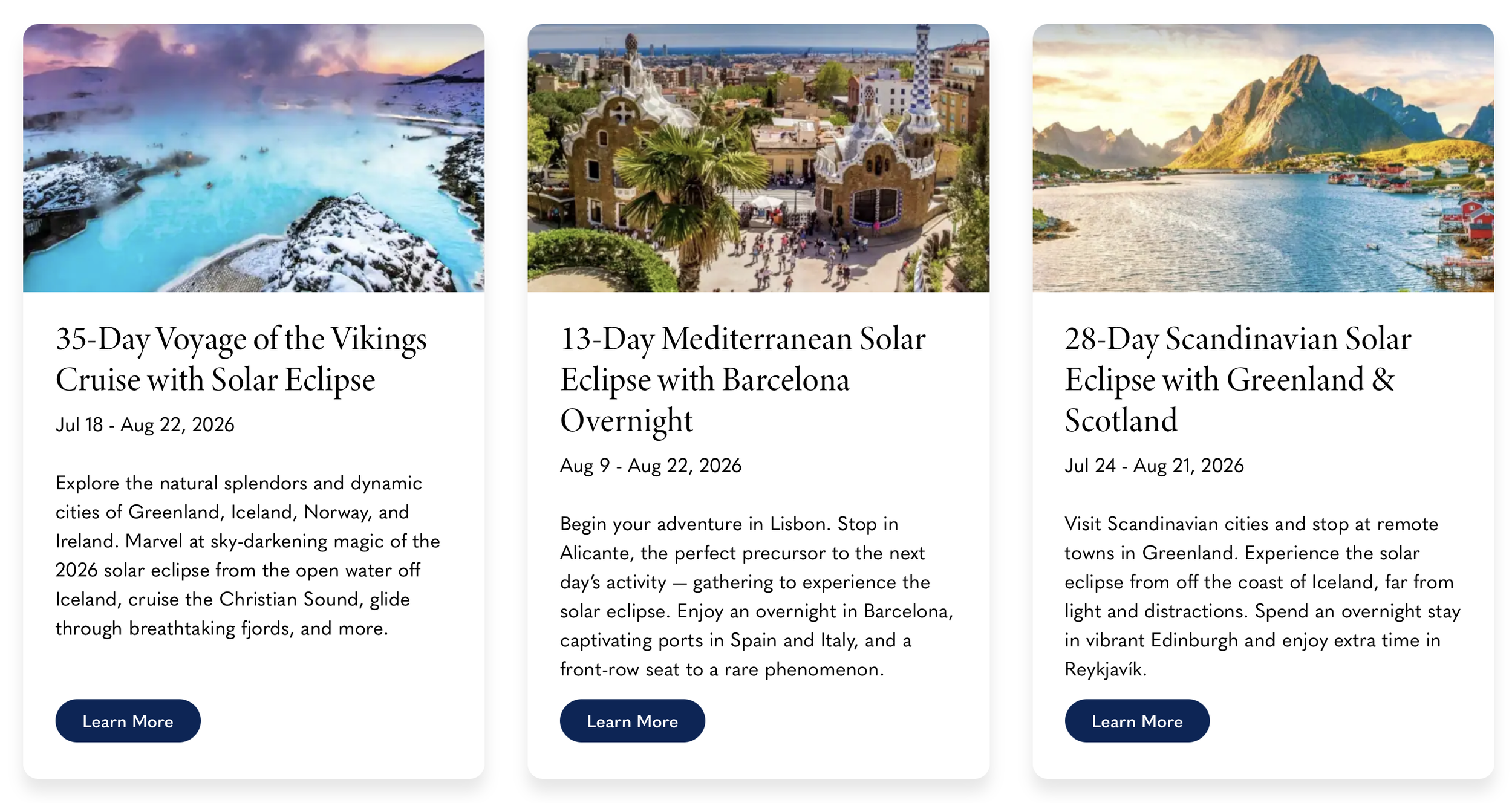 Regardless of the cons, total solar eclipse cruises are very popular and many of the cruises planned for 2026, 2027 and 2028 are already sold out. Here is a list of some of the cruises planned to be at sea specifically during a total solar eclipse: